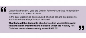 * Voorbeeld besparingen gebaseerd op een kleine hond die tot 10kg weegt. De voordelen van het HPC-loyaliteitsprogramma zijn: initiële vaccinatie (inclusief besmettelijke hondenhoest), jaarrond producten voor vlooien en ontwormen, 50% korting op chippen bij de kat, 10% korting op castratie, 10% korting op gebitsreiniging (hieronder valt de reiniging/tandsteenbehandeling, exclusief overige handelingen en producten), onbeperkt nagels knippen. De kosten van de losse aankoop van deze goederen en diensten (gebaseerd op gemiddelde prijzen uit een steekproef van 25 CVS-praktijken) zouden resulteren in een gemiddelde jaarlijkse besparing van meer dan €100. De voordelen, kosten en besparingen variëren naargelang het type en de grootte van uw huisdier.